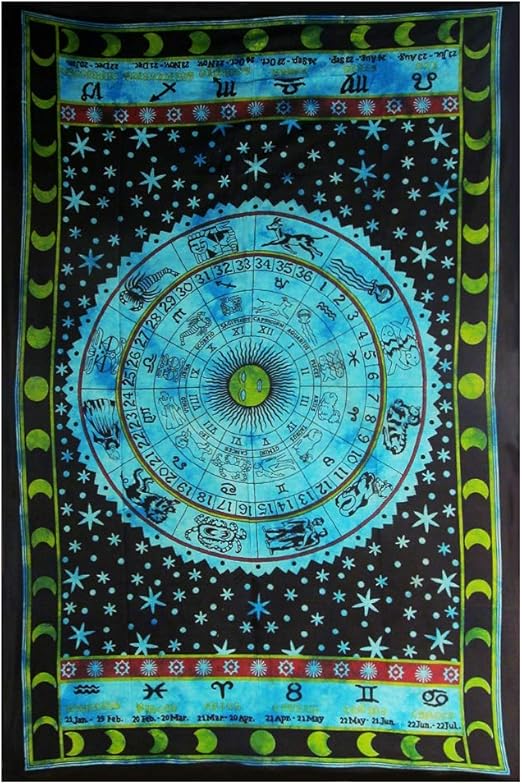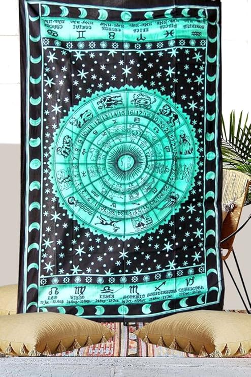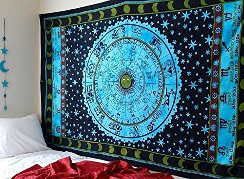 Turquoise Zodiac Horoscope Tapestry Indian Astrology Hippie Wall Hanging Divine Ethnic Decorative Gift Art Sun Moon Celtic Zodiac Tapestry